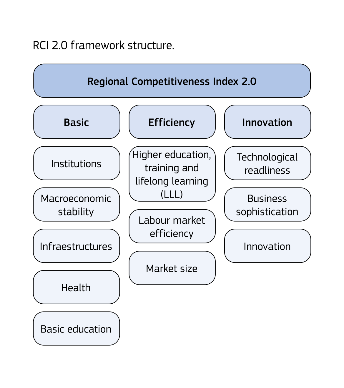 L’European Regional Competitiveness Index (, RCI 2.0) nasce nella sua prima versione del 2010. L’edizione 2022 si basa su 68 indicatori, di cui 48 al livello regionale. L’RCI è composto da tre sottoindici: “Base”, “Efficienza” e “Innovazione” – e di 11 pilastri che descrivono i diversi aspetti della competitività.